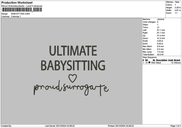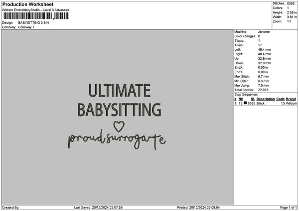 Babysittingtext Embroidery File 6 sizes