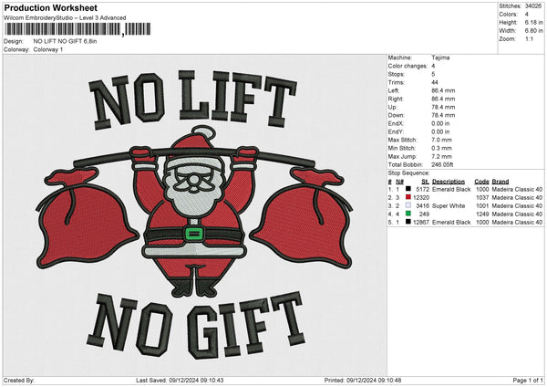 NO LIFT NO GIFT Embroidery File 6 size