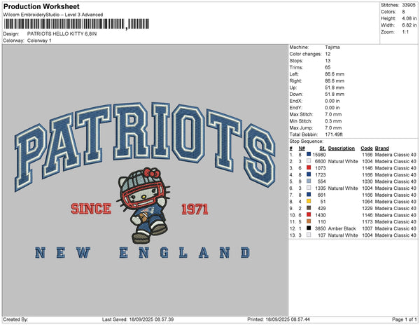 PATRIOTS HELLO KITTY Embroidery File 6 sizes