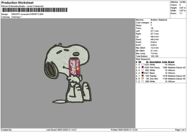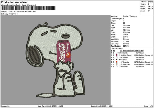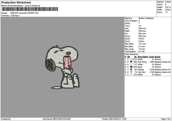 Snoopy Cola Cherry Embroidery File 6 sizes