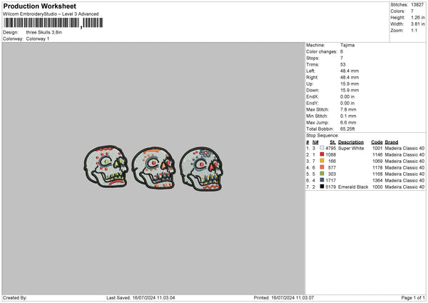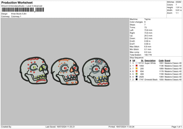 Three Skulls Embroidery File 6 sizes